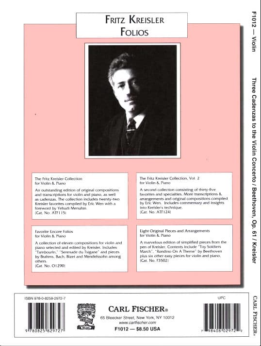 Beethoven - Cadenzas for Beethoven's Violin Concerto, Opus 61 - Violin - arranged by Fritz Kreisler - Carl Fischer—